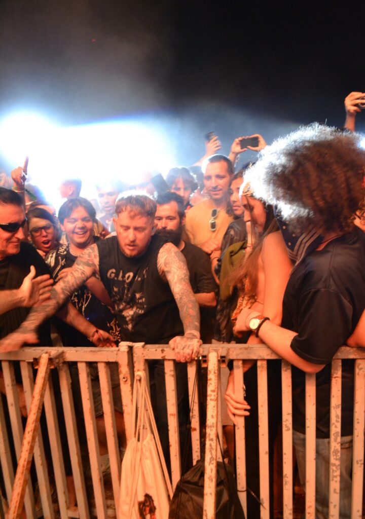 U jednom trenutku eto njega dole u publici (koje je, inače, bilo poprilično, stari i mladi rokeri, pankeri, skinhedsi…). Zaustavlja se oko četrdeset metara od bine, ima mikrofon sa sobom i peva, dok se zaustavlja kaže im da naprave krug oko njega, zatim odmah pored tog kruga drugi posetioci prave drugi krug, i tako desetak krugova. I tu počinje vatrena zmija, publika trči u jednom pravcu, a u drugom pravcu trči Frank, vide se licem u lice, fantastičan prizor, Frenk trči i peva, publika peva, skače i viče u krug, a gore na bini ostala trojica jednostavno svirački razbijaju. Kakvo sviranje, kakva predstava, veličanstveno.